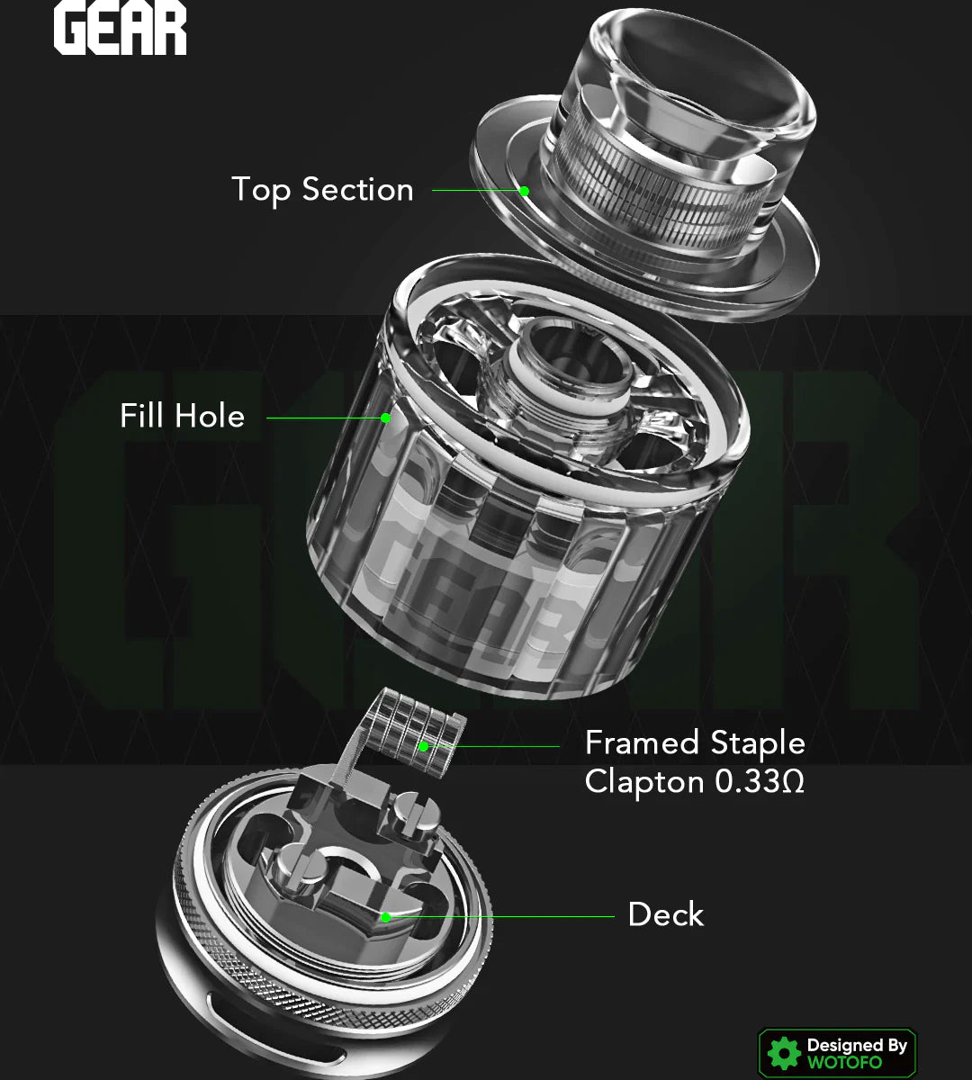 The Wotofo Gear V2 RTA is far more than a compact single-coil RTA. It is an upgrade of our Gear RTA that retains the incredibly user-friendly build deck, postless design, and a simpler design that significantly improves its performance far better than you might expect from such a compact RTA. The Wotofo Gear V2 RTA is, in essence, a single-coil and compact RTA. However, the V2 is an upgrade that takes the original simplicity to another level while boosting the performance of the device by a significant margin.